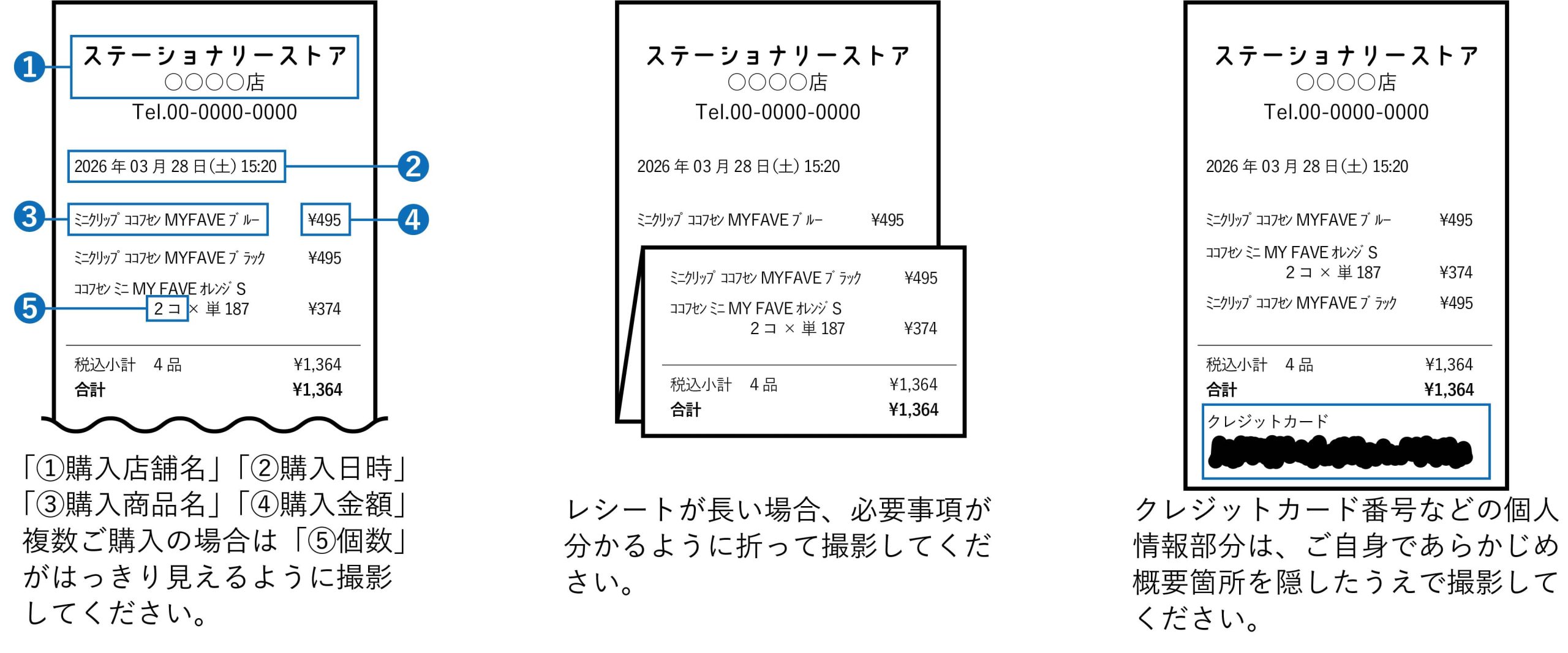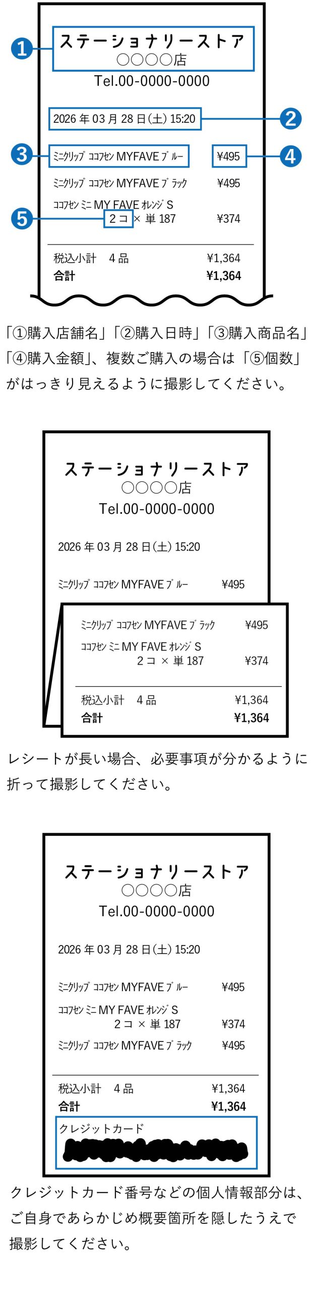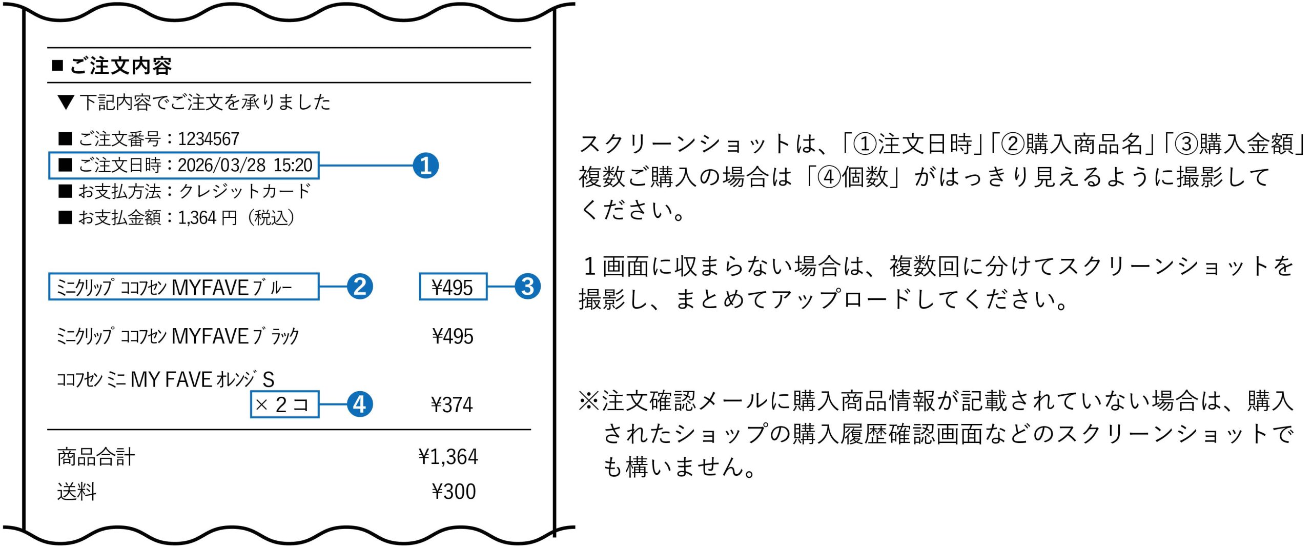 アップロードするレシートの写真、購入画面の画像については、下記をご参照ください。